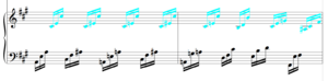 Tone clusters are recognised as tone clusters, if, in inkprint notes, at least two notes are positioned together in a chord and if all notes of this chord have square heads. Only the two outer note heads are counted for the tone cluster.